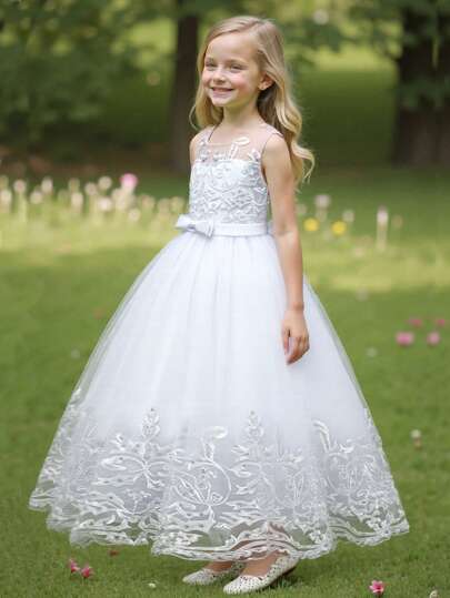 Tween Girl High-End Embroidered Sequin Sleeveless Flower Girl Wedding Dress, Puffy Birthday Wedding Party Princess Gown - White - View 1