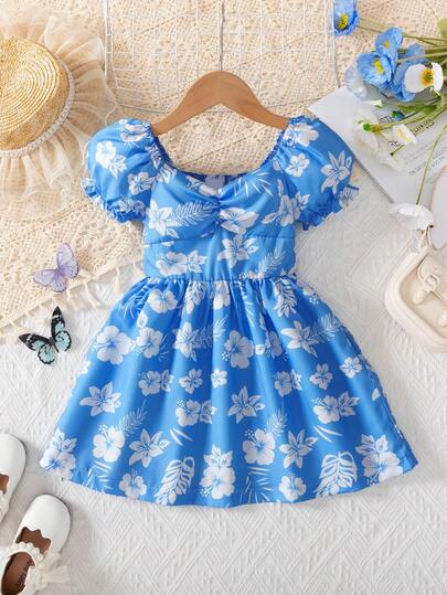 BASUSARRI Young Girl Summer Floral Sweetheart Neck Puff Sleeve Girls Dress, Fresh & Fashionable, Cute & Minimalist - Blue - View 1