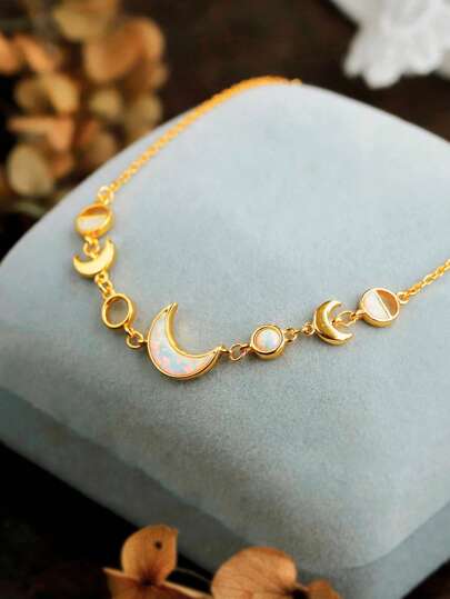 1pc S925 Sterling Silver Elegant Artificial Australia Opal Moon Charm Bracelet, Vintage Style Versatile Jewelry Gift For Women, Suitable For Daily Wear And Parties - Manufactured Opal Crescent Bracelet - View 1
