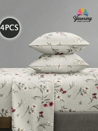 4Pcs Black White Garden Flower Pattern Sheet Set Bedding Set, 1pc Fitted Sheet & 1pc Flat Sheet& 2pcs Pillowcase Bedding Mattress Protector Set (Not Including Pillow Core)Luxury Fitted Sheet Set King Queen Full TWIN SIZE Sheet Deep Pocket Up To 11.8 Inch Pillowcase, Soft Breathable Wrinkle-Free Better For Sleep, Luxury Hotel Style, Gift For Mom Dad Friend Farmhouse Bedding Sets - Multicolor - View 1