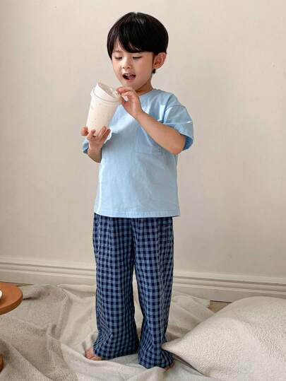 Dazy Kids 2pcs/Set Young Boys Round Neck Solid Knit Short Sleeve Tee + Woven Plaid Pants Home Outfit, Spring/Summer - Blue - View 1