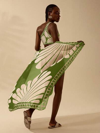 CAJUNI Women's Boho Black & Beige Seashell Print Casual Beach Swimwear Cover Up Skirt, Summer, Country Concert - Green - View 2
