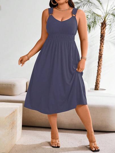 Celure Plus Size Solid Color Pleated Casual Summer Dress Maxi Women Outfit - Blue - View 1