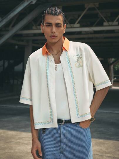 AXEPEAK Men's Casual Woven Colorblock Collar Palm Tree Digital Print Short Sleeve Shirt - Multicolor - View 1