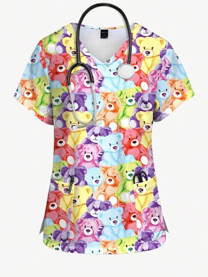 PopScrub Scrub Top With Cute Colorful Bear Print, Bear Pattern V-Neck Short Sleeve Shirt For Women, Summer Scrub Uniform Print V Neck Frosted Scrub Top, Casual Short Sleeve Work Wear, Women Sweetheart V-Neck Ruched Blouse, Women Short Sleeve V-Neck Nurse Uniform Shirt With 2 Pockets, Soft Stretchy Ruched Graphic Tee - Multicolor - View 1