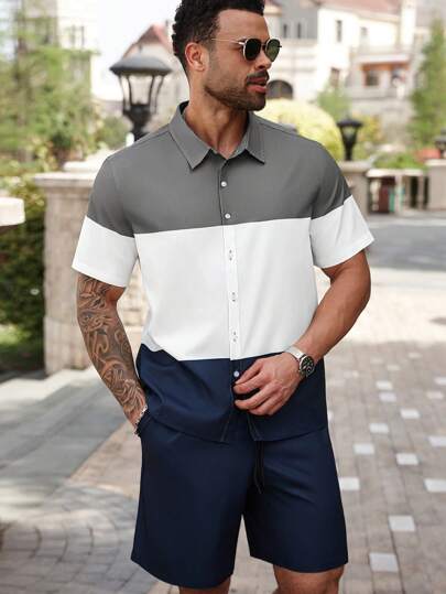 Manfinity Homme Men's Plus Size Summer Casual Contrast Color Patchwork Shirt And Shorts Set - Multicolor - View 1