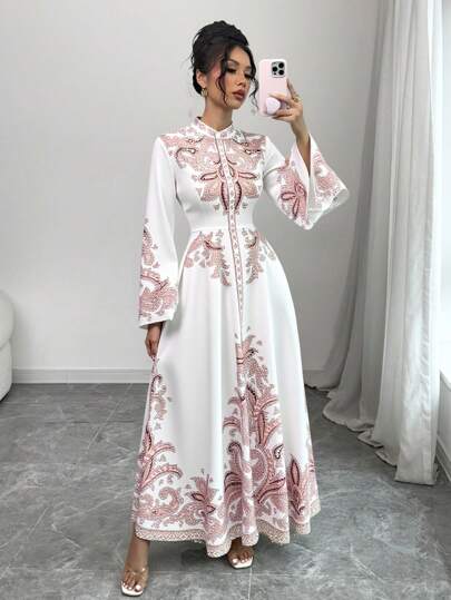 Chiquease Women's Plant Print Stand Collar Flare Sleeve Waist Cinched Elegant Dress - White - View 1