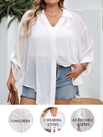 SHEIN CURVE+ Super Plus Size Sheer Sunscreen Shirt, Adjustable Sleeve, Suitable For Beach And Holiday Trips, Curve Plus, Boho Vacation Beach Outfits For Woman/Beach /Beach Vacation Outfits/Beach Essentials / Graduation/Tea Party  - White - View 1