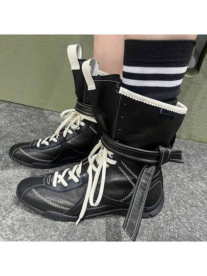 Small Increase Boxing Boots Women's New Retro Mid-Tube Fashion Boots Leather Moral Training Boots - Black - View 1