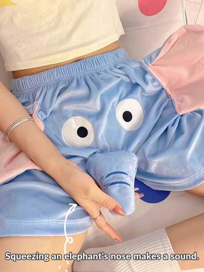 1pc Women/Couple Funny Cartoon Elephant Design Pajama Shorts, Comfortable & Loose Bottoms Sleep Shorts, Applicable For All Seasons, Suitable For Casual Wear - Blue - View 1