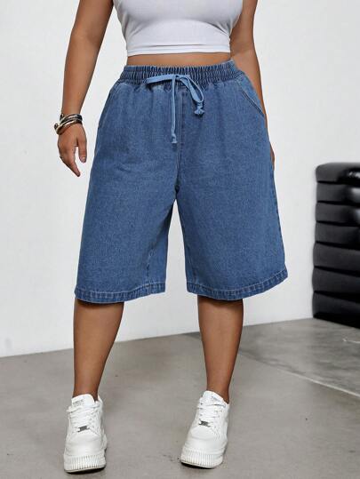 SHEIN EZwear Plus Size Denim Shorts, Casual Slim Cargo Bermuda Pants, Blue,Summer / Summer Outfits For Women/ Summer Clothes / Cute Summer Tops/ Summer Bottoms/Summer Dresses For Women - Blue - View 1