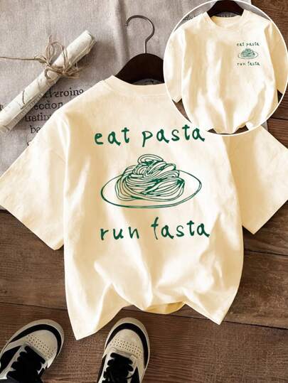 SHEIN MOOSTA Women's Summer Casual Pasta Pattern Round Neck Short Sleeve T-Shirt - Apricot - View 1
