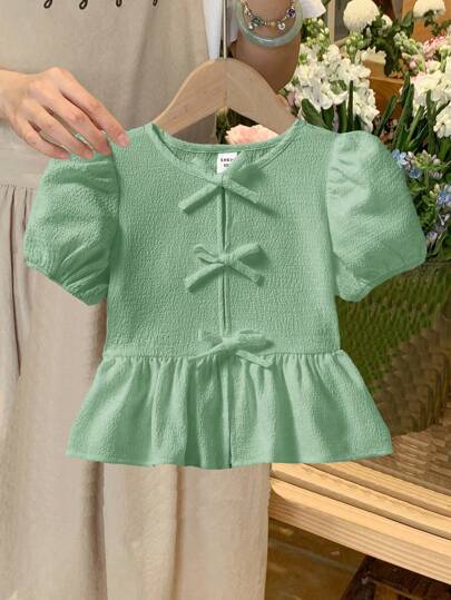 SHEIN Tween Girls Daily Casual Solid Color Woven Crew Neck Short Sleeve Pullover Top - Green - View 1