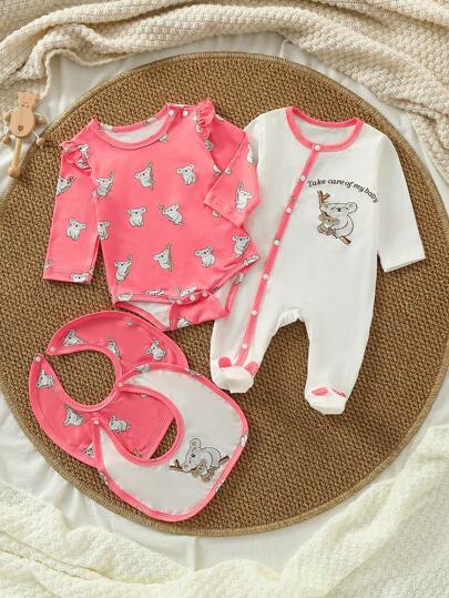 Newborn Baby Cute Koala Bear Print Long Sleeve Romper With Extended Wings Sleeve And 2pcs Bibs, Multi-Piece Outfit Set - Multicolor - View 1