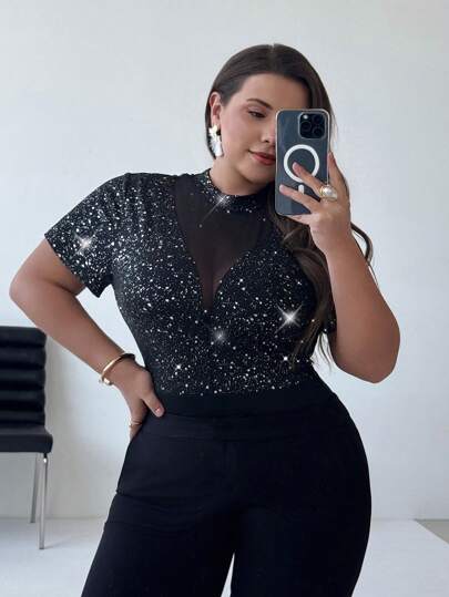 Firerie Plus Size Women Elegant Shine Silver Heat Transfer Mesh Patchwork V-Neck Elastic Bodysuit, Casual Summer Vacation Party Club Wear - Black - View 1