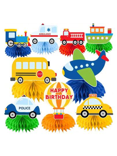 9pcs, Transportation Party Decorations, Transportation Birthday Decorations Honeycomb Ornament, For Living Room Table Decoration - Designed For Hosting Memorable Transportation Birthday Party Celebrations. - Yellow - View 1