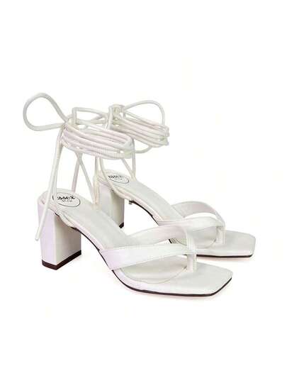 XY LONDON Kiko Women's Lace Up Thong Strap Mid Block Heels, Toe Post, Square Toe, Heeled Sandals, Black, Green, Silver, White, Synthetic Leather, Nightclub Style, Sexy, Party, Spring, Summer - White - View 1