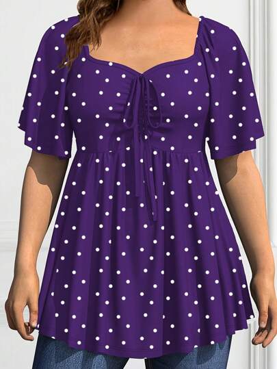 SHEIN LUNE Plus Size Women Polka Dot Print Drawstring Front Short Sleeve Fitted Knit T-Shirt, Summer - Multicolor - View 1