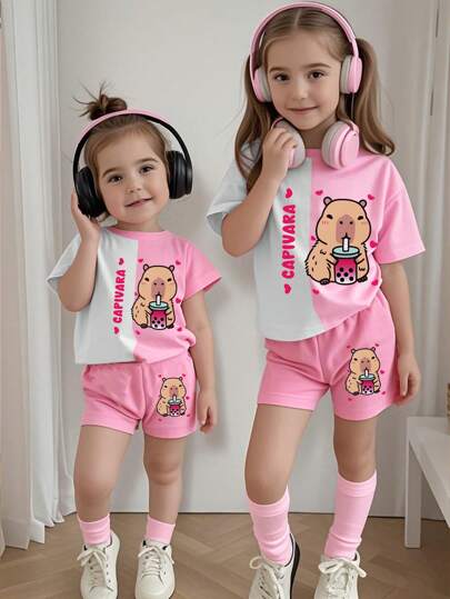 SHEIN Baby Girls Casual Fashion Creative Paddington Bear Colorblock Cute Cartoon Print Casual Short Sleeve T-Shirt And Shorts 2 Pieces Set, Sibling Outfits Matching Outfits (2 Sets Pieces Are Sold Separately) - Multicolor - View 1