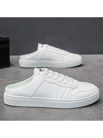 Summer Slip-On Shoes For Men, Solid Color Casual PU Leather Lace-Up Sneakers, Office & Outdoor, All Season - White - View 1