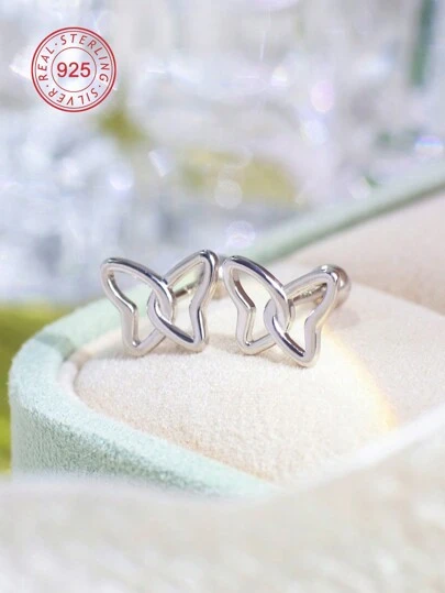 Artepollo 1 Pair 925 Silver Butterfly Earrings, Hypoallergenic Spiral Earring Cuff, Minimalist Cute, Gift Box Packaging, Birthday Gift For Young Girl - Silver - View 1