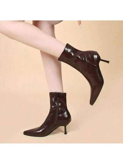 French Style Short Boots Elastic Thin Boots Women Autumn And Winter New Socks Boots Stiletto Short Boots Pointed High Heels - Brown - View 1