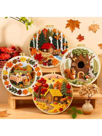 [Printed Embroidery Craft Kit] Beginner DIY Handmade Set Includes Needles, Threads, Multiple Forest Theme Patterns To Choose From (Autumn Forest Cabin/Tree House Friends/Autumn Picnic), Home Decor Creative Handcraft, Embroidery Starter Kit - Multicolor - View 1