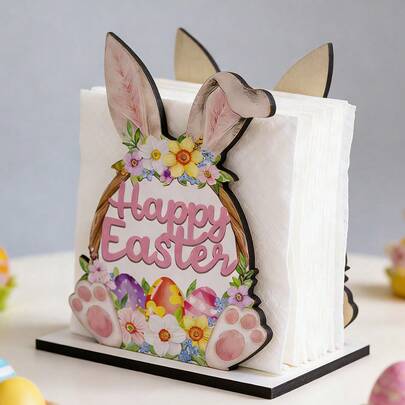 1/2pcs Easter Kitchen Paper Towel Holder, Wooden Napkin Clip With Rabbit, Easter Blessings Pattern, For Cocktail Napkins, Easter Table Decor, Home, Hotel, Office, Easter Holiday Table Setting, Desktop Accessory - Multicolor - View 1