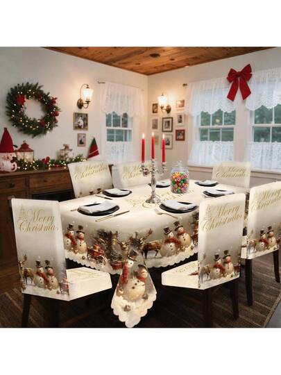 1/4/5/6/35pcs Christmas Slogan, Reindeer, Snowman Pattern Decorative Digital Print Tablecloth & Chair Cover Set - Indoor Furniture Table Dust-Proof & Washable Tablecloth, Suitable For Indoor Dining Room Decor, Family Gatherings, Gifts, Holiday Parties - Christmas-b - View 7