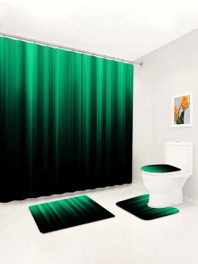 1/4 Piece Ombre Green Black Striped Bow Pattern Printed Waterproof Shower Curtain, Striped Decor Curtain, Non-Slip Bath Mat, Toilet U-Shaped Mat, Modern Home Bathroom Decor, Includes 12 Shower Curtain Hooks, Polyester Fabric, Machine Washable, Suitable For Hotel, Apartment, Home Bathroom Decoration, All Seasons, Great Gift For Friends And Family - Multicolor - View 1