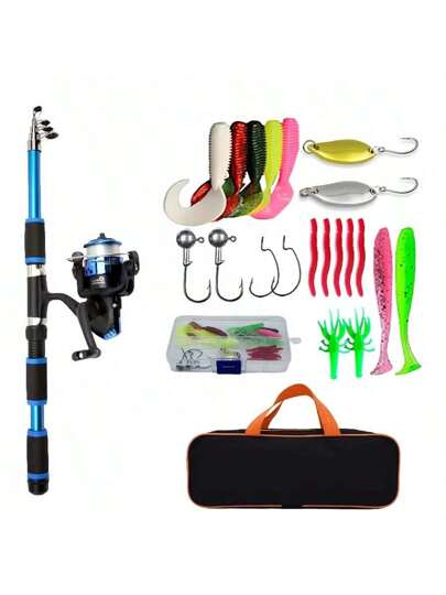 1.8m Telescopic Fishing Rod Combo Set: Includes Spinning Reel, Lures, Hooks And Travel Rod Case, Suitable For Freshwater And Saltwater Fishing Beginners - Blue - View 1
