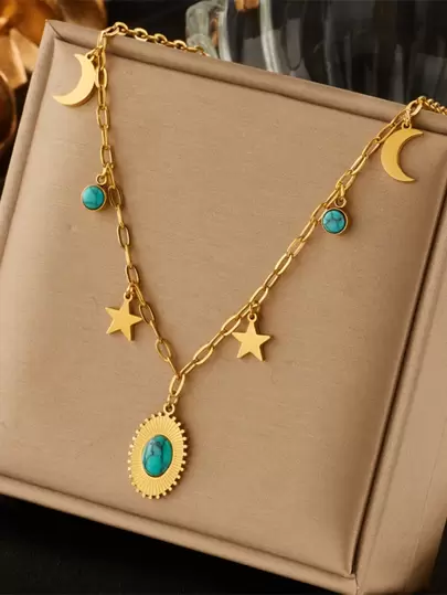 1 Gold Plated Titanium Steel Blue Turquoise Accessories Star Moon Pendant Chain Necklace - Multicolor - View 1