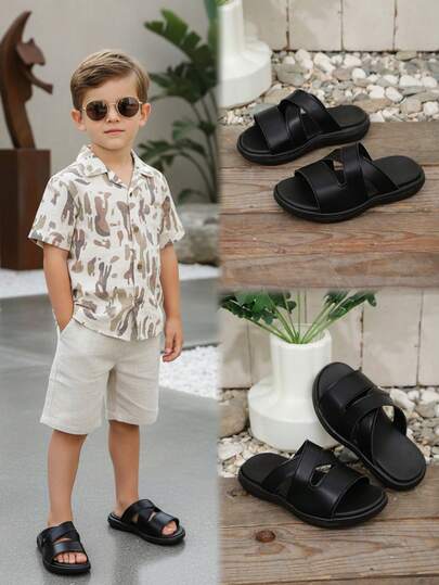 1 Pair Black Plus Size Flat Sandals For Teens & Kids, Soft PU Leather, Classic Round Toe, 2CM Thick Heel, Slip-On Design, Fashion & Cute, Suitable For 3-15 Years Old Boys & Girls, Casual, Beach, School, Holiday - Black - View 1