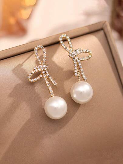 1 Pair Bowknot Rhinestone & Faux Pearl Earrings, French Design Fashionable Earrings - Gold - View 1
