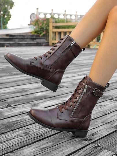 1 Pair Classic Fashion Lace-Up Metal Eyelets Side Zipper Women Plus Size Mid-Calf Boots, Suitable For Campus & Outdoor - Coffee Brown - View 4