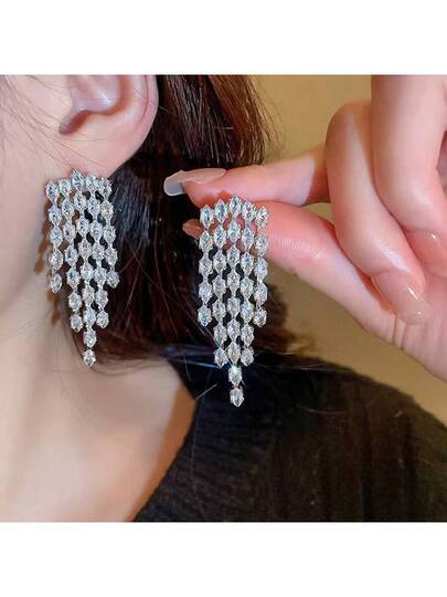1 Pair Elegant Alloy Rhinestone Tassel Long Earrings, Suitable For Women's Party And Daily Wear - Silver - View 1