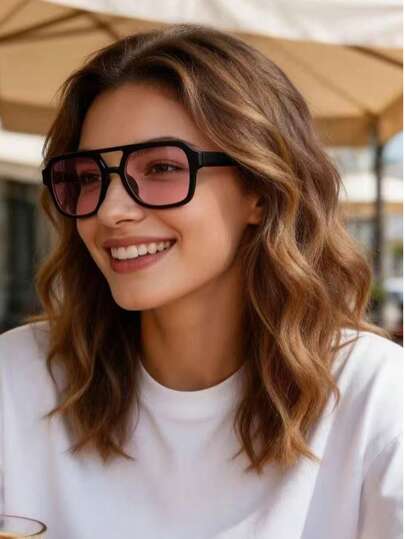 1 Pair Geometric Frame Dual-Bridge Fashion Glasses, Casual Women's Beach Accessory, Basic Color Tones, Suitable For Pairing With Sweaters, Jeans, Sweatpants, Hoodies, Jackets, Dresses, And Long-Sleeve Shirts To Create A Stylish And Elegant Look, Suitable For Family Outings, Summer Beach Vacations, Outdoor Activities And Other Occasions - Pink - View 1