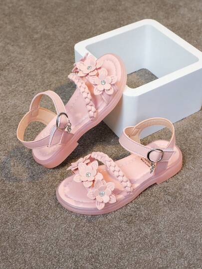 1 Pair Girls' Princess Style Floral & Pearl Decor Soft Bottom Hook Loop Casual Sandals, Slightly Small Sizing, Suitable For Summer, School, Outdoor Activities, Comfortable Flat Sandals - Pink - View 1