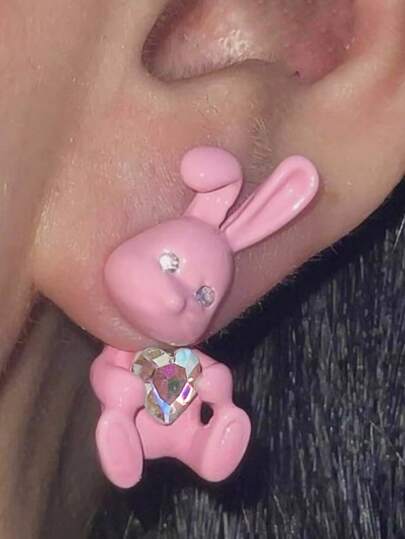 1 Pair Heart-Shaped Rhinestone Enamel Dangle Earrings, Cute Front & Back Two Pieces Earrings For Girls - Pink Bunny - View 1