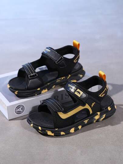 1 Pair Kids' Open Toe Sandals, Summer Breathable Beach Shoes With Hook And Loop Strap Design, Lightweight Sports Style Suitable For Beach And Casual Occasions - Gold - View 1