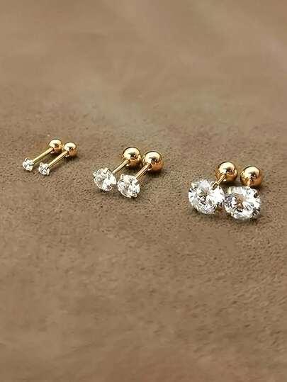 1 Pair Mini 14K Gold Plated Cubic Zirconia Stud Earrings, Elegant & Sparkling Earrings For Girl - Gold - View 3