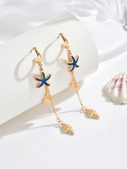 1 Pair New Creative Ocean Beach Vacation Style Fashion Minimalist Long Tassel Starfish Shell Dangle Earrings - Yellow Gold - View 1