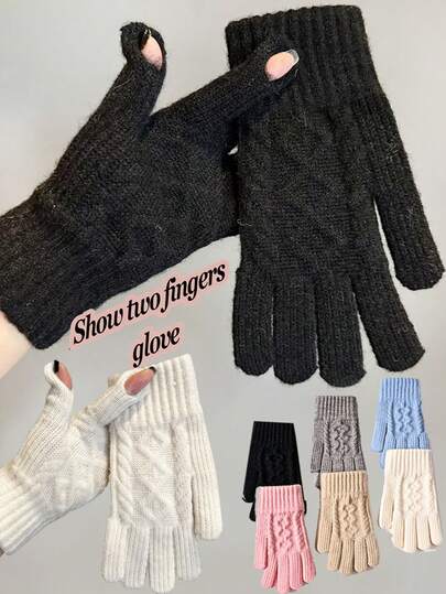 1 Pair Of Korean Style Two Finger Touch Screen Gloves, Personalized And Fashionable Knitted Women's Warm Gloves, Autumn And Winter Cold Proof Thick Dew Cycling Five Finger Gloves, Autumn And Winter Touch Screen Gloves For Men And Women, Knitted Yarn For Cold Proof And Warm With Velvet Five Finger Gloves For Students - Multicolor - View 1