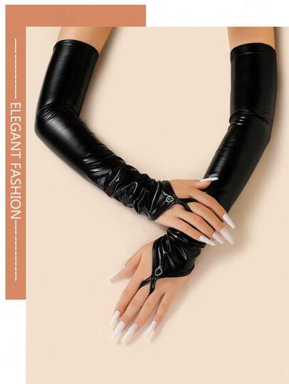 1 Pair Shiny Latex Fingerless Gloves, Sexy Costume Party Tight Fit Arm Sleeves For Women - Black - View 1