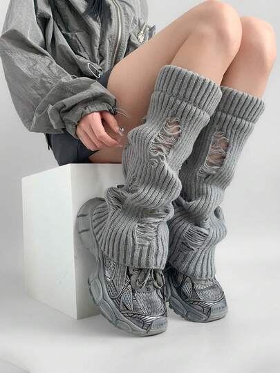 1 Pair Spring/Summer Thin Sweet & Spicy Calf Leg Warmers, Knitted Dystopian Y2K Style, Japanese JK Millennium Subculture Distressed Knit White/Grey/Black Leg Warmers, Collegiate Slimming Versatile Sock Covers - Multicolor - View 1