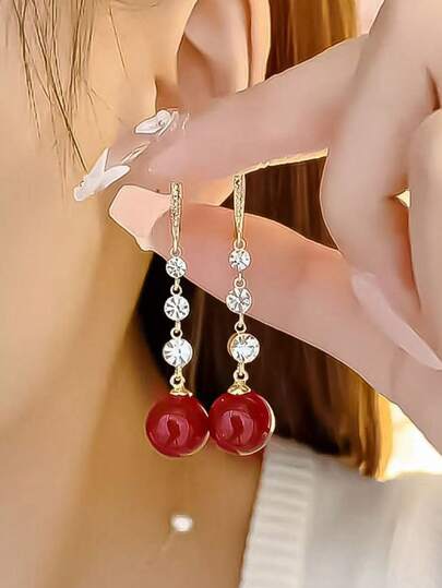 1 Pair Vintage Style Long Red Beaded Earrings With 3 Rhinestones, Fashionable Personalized Earrings - Red - View 1