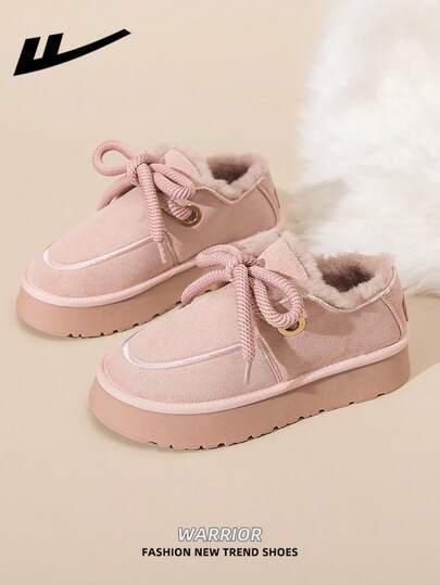 1 Pair WARRIOR Women's Thick Sole Cute Warm Soft Bottom Casual Shoes, Low-Top Outdoor Flat Shoes For Winter Commute, Round Toe Low Heel Solid Color Elegant Soft Bottom Furry Flat Shoes, Women Low-Top Leather Face Sports Skateboard Shoes, Elegant Shoes - Pink - View 1
