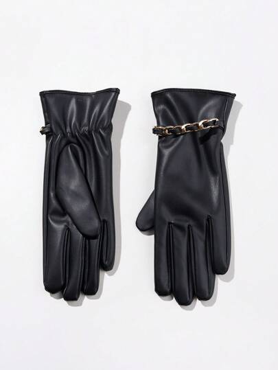 1 Pair Women's Black Pu Leather Gloves With Chain And Touch Screen Feature, Warm And Windproof, Perfect For Daily Use In Autumn And Winter - Black - View 1