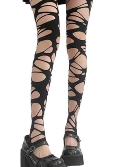 1 Pair Women's Fashion Sexy Hollow Ripped Stockings, Valentine's Day Easter Halloween Costume, Gothic Style Pantyhose, Sexy Mesh Hollow Black Tights, Y2K Style, Fashionable And Classic, Sexy, Elegant, Cute, Beautiful And Comfortable, Snag-Resistant, Perfect For Various Festivals, Couple Dates, Daily Outings, Office Commuting, Outdoor Activities, Camping, Role-Playing And Performances - Available In Multiple Sizes - Multicolor - View 1