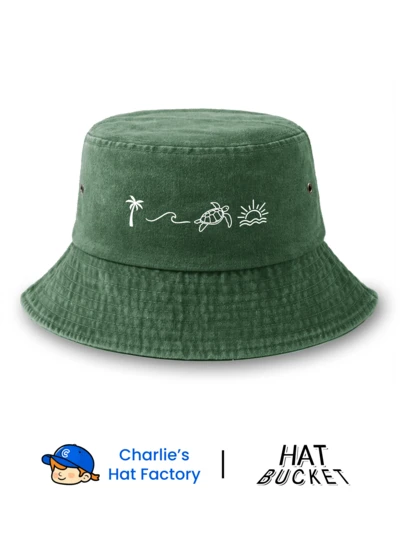 1 Pc Unisex Vintage Washed Bucket Hat - Tropical Palm Tree, Wave, Turtle & Sun Graphic - Available In Earthy Tones (Black, Navy, Grey, Khaki) & Pop Colors (Burgundy, Turmeric) - Soft Texture Packable Sun Cap For Beach Vacation & Island Trip - Beach - View 1